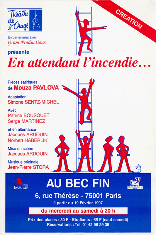 Cette pièce a été créée à Paris, restant à l'affiche environ deux ans, avant que d'être reprise par la compagnie théâtrale L'Orage, dirigée par Patrice Bousquet, qui de temps en temps la présente à nouveau.
